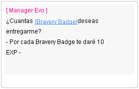 El Manager Evo podrá ayudarte a subir tu nivel de BG Evo, deberás entregarle Bravery Badge para obtener EXP. También puedes consultar con tu nivel, los puntos y experiencia que llevas acumulados.